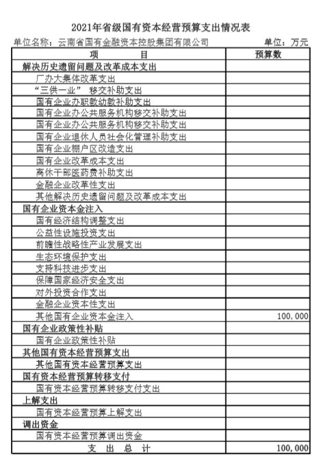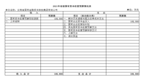 根據(jù)《云南省財政廳關(guān)于批復(fù)云南省國有金融資本控股集團有限公司2021年省級國有資本經(jīng)營預(yù)算的通知》(云財金〔2021〕18號)要求,現(xiàn)將我公司2021年國有資本經(jīng)營預(yù)算情況公示如下: