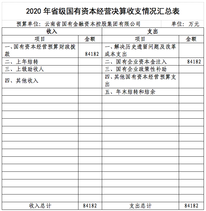 根據(jù)《云南省財政廳關(guān)于2020年度國有資本經(jīng)營決算的批復》(云財資〔2021〕81號)要求,現(xiàn)將我公司2020年國有資本經(jīng)營決算情況公示如下: