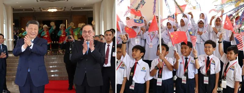 4月16日下午,國家主席習(xí)近平同馬來西亞總理安瓦爾在布特拉加亞總理官邸舉行會談。習(xí)近平乘車抵達(dá)總理官邸時,安瓦爾熱情迎接。馬來西亞青少年揮舞兩國國旗,奏響歡快的鼓樂,跳起熱情的民族舞蹈,熱烈歡迎遠(yuǎn)道而來的貴賓(拼版照片)。新華社記者 黃敬文 攝