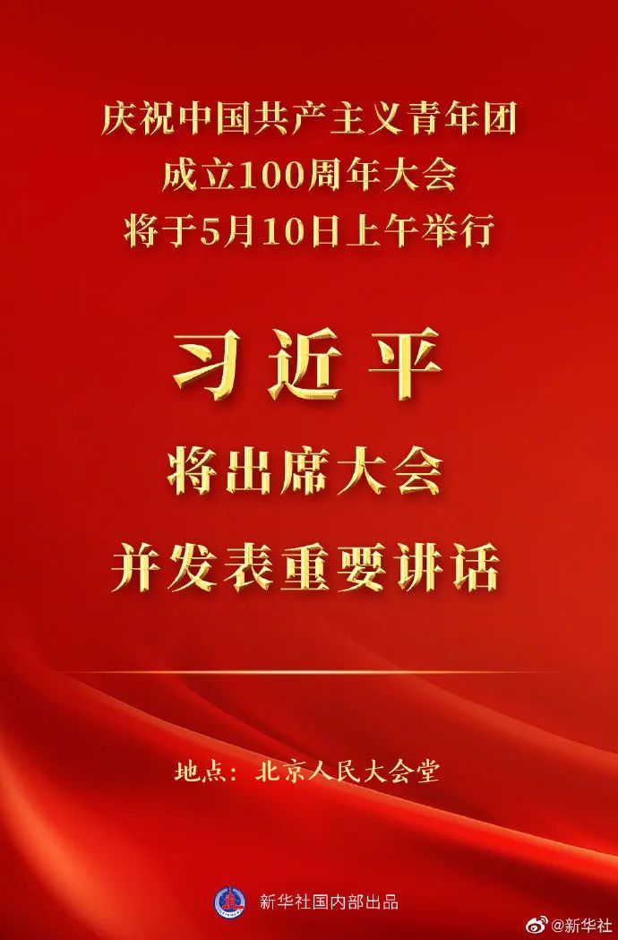 慶祝中國共產(chǎn)主義青年團(tuán)成立100周年大會將于5月10日上午在北京人民大會堂隆重舉行。中共中央總書記、國家主席、中央軍委主席習(xí)近平將出席大會并發(fā)表重要講話。
