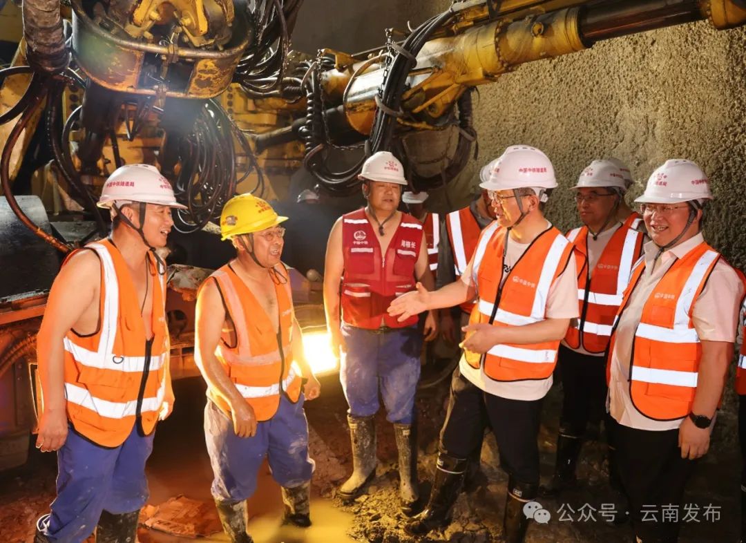 王予波在大瑞鐵路高黎貢山隧道1號豎井地下765米深處的施工掌子面看望一線工人。