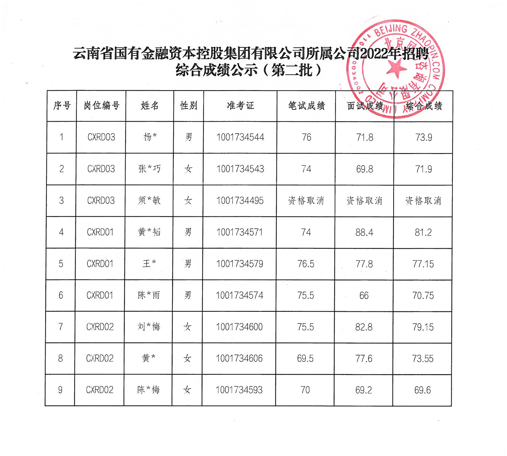 云南省國有金融資本控股集團有限公司所屬公司2022年招聘綜合成績公示(第二批)