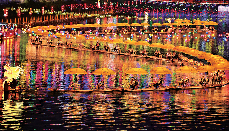 蛇年春節(jié),全國各地張燈結(jié)彩,人們參加各種喜慶活動,紅紅火火迎新春。圖為2025年1月21日晚,游客在湖北省宣恩縣貢水河中乘坐竹筏賞夜景。新華社發(fā) 宋文/攝?
