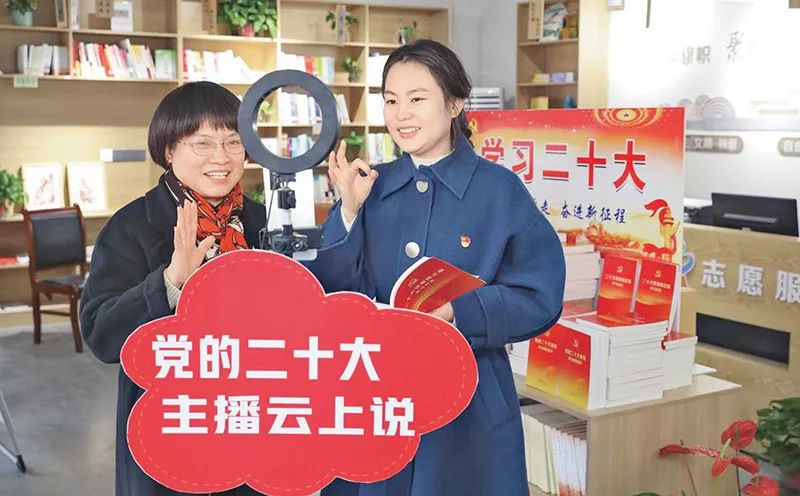江蘇省淮安市淮陰區(qū)淮高鎮(zhèn)通過開設(shè)黨的二十大書籍專區(qū)、開展“黨的二十大主播云上說”活動等多種形式,掀起當(dāng)?shù)貙W(xué)習(xí)黨的二十大精神熱潮。圖為2022年12月8日,淮高鎮(zhèn)黨員志愿者通過網(wǎng)絡(luò)直播宣講黨的二十大精神。 人民圖片 趙啟瑞/攝