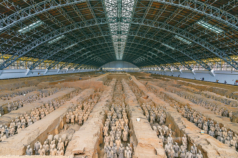 秦始皇陵是中國歷史上第一個(gè)多民族的中央集權(quán)國家的皇帝秦始皇于公元前246年至公元前208年?duì)I建的。作為秦始皇陵陪葬墓坑之一的兵馬俑坑于1974年被發(fā)現(xiàn),被譽(yù)為“世界第八大奇跡”。圖為秦始皇兵馬俑博物館一號(hào)坑全景。人民圖片 丁俊豪/攝