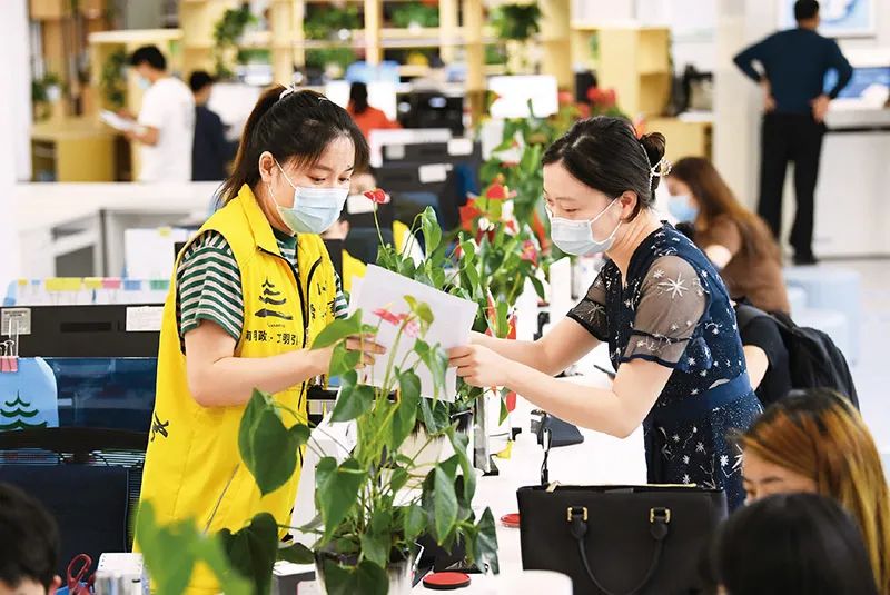 ?營商環(huán)境是企業(yè)生存發(fā)展的土壤。圖為2022年6月15日,貴州省貴陽市南明區(qū)政務(wù)服務(wù)大廳法人服務(wù)區(qū)的工作人員在給企業(yè)人員講解減稅降費(fèi)優(yōu)惠政策。 ? ?求是圖片 趙松/攝