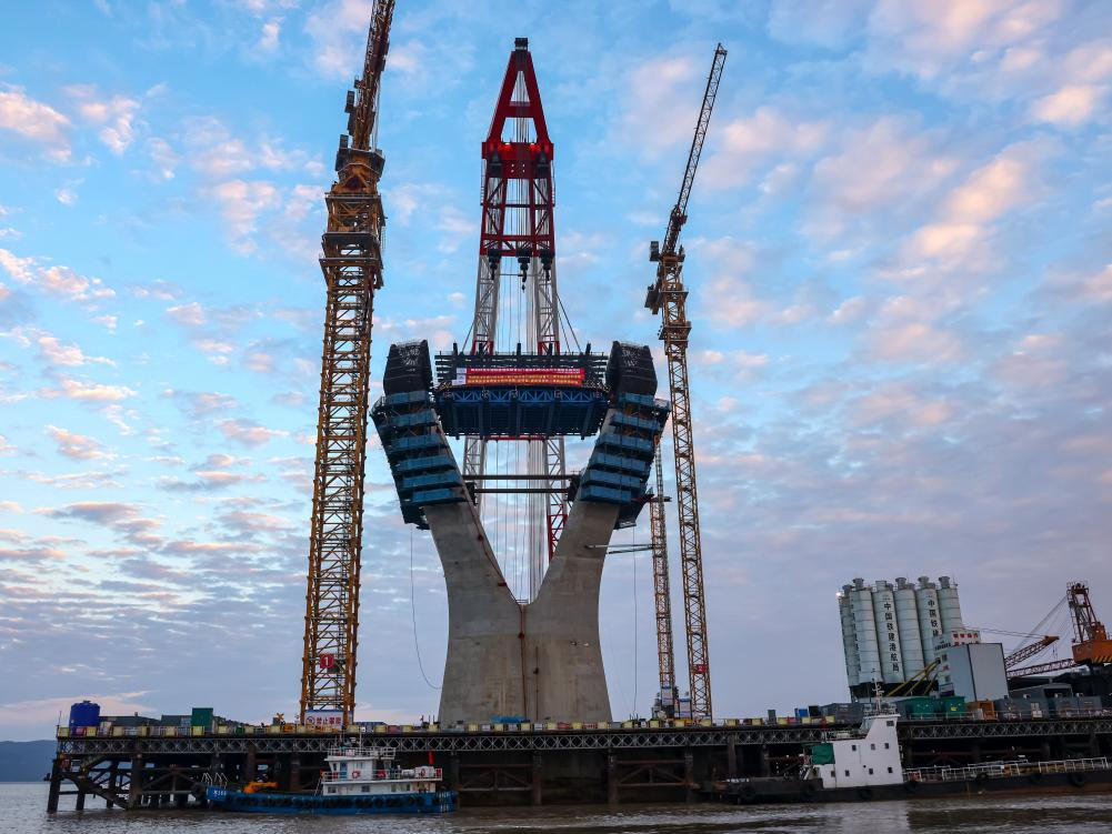 圖為2025年1月14日,寧波舟山港六橫公路大橋二期青龍門特大橋首個主塔(5號主塔)下橫梁型鋼骨架順利完成吊裝。人民圖片 姚峰/攝