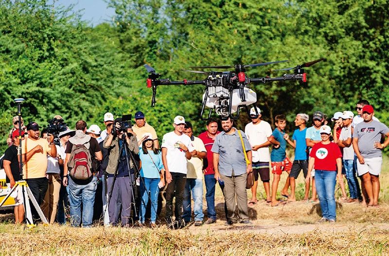 圖為2024年2月2日,在巴西阿波迪舉行的中巴農(nóng)業(yè)機(jī)械化合作示范項(xiàng)目啟動(dòng)儀式上,人們觀看一款中國(guó)生產(chǎn)的農(nóng)用無人機(jī)。新華社記者 王天聰/攝