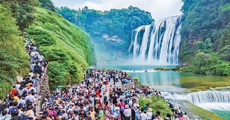 推動(dòng)高質(zhì)量發(fā)展,需要著力擴(kuò)大國內(nèi)需求,激發(fā)有潛能的消費(fèi)。圖為2023年10月3日,游客在貴州省安順市黃果樹瀑布景區(qū)游玩。新華社發(fā) 陳熙/攝