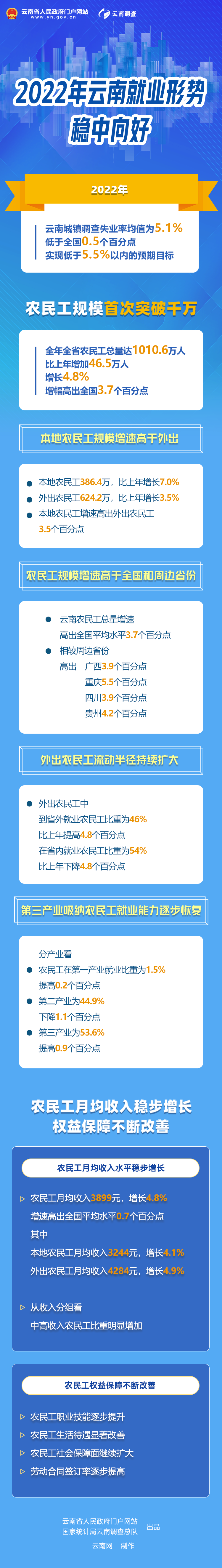 國(guó)家統(tǒng)計(jì)局云南調(diào)查總隊(duì)根據(jù)國(guó)家現(xiàn)行統(tǒng)計(jì)調(diào)查制度規(guī)定依法開展的相關(guān)調(diào)查結(jié)果顯示:2022年,云南城鎮(zhèn)調(diào)查失業(yè)率均值為5.1%,低于全國(guó)0.5個(gè)百分點(diǎn),實(shí)現(xiàn)了低于5.5%以內(nèi)的預(yù)期目標(biāo)。全年全省農(nóng)民工總量達(dá)到1010.6萬,比上年增加46.5萬人,增長(zhǎng)4.8%,增幅高出全國(guó)3.7個(gè)百分點(diǎn),實(shí)現(xiàn)了就業(yè)穩(wěn)、民生穩(wěn)。