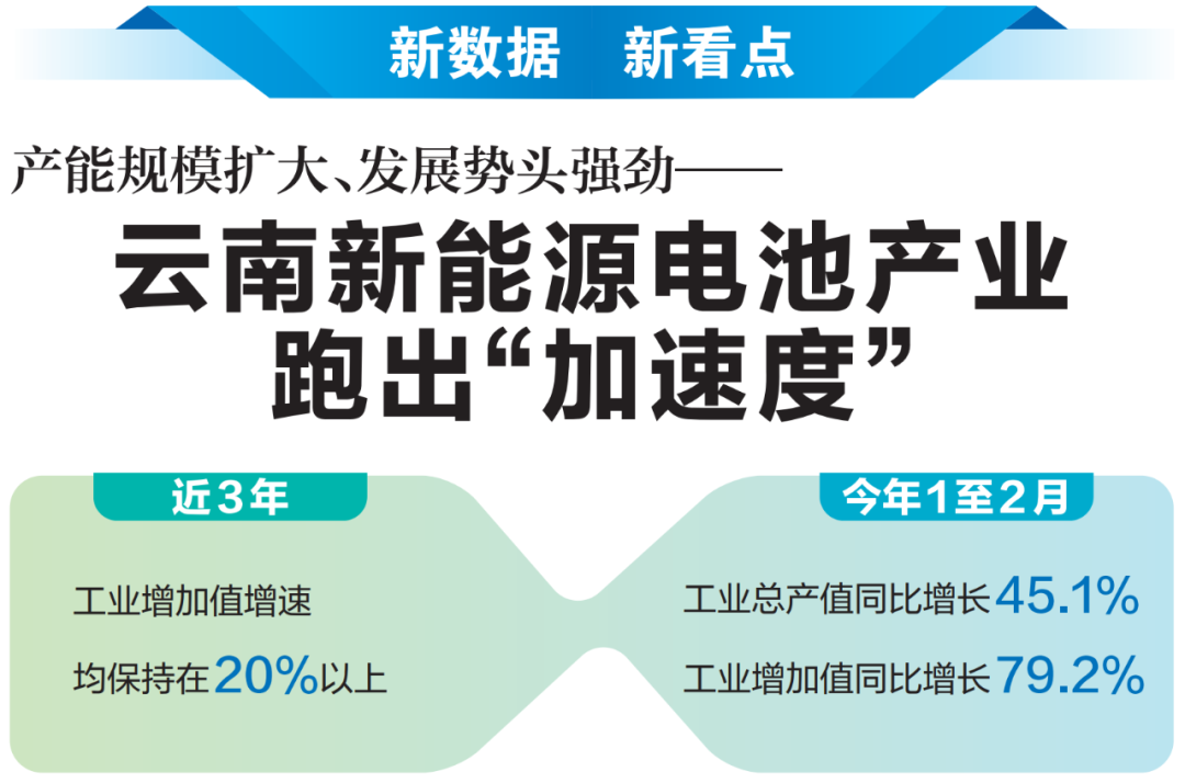 新能源電池產(chǎn)業(yè)作為“綠電+先進制造”的優(yōu)質(zhì)賽道,是云南省近3年來增速最快的產(chǎn)業(yè)之一,工業(yè)增加值增速均保持在20%以上。依托良好的資源稟賦和產(chǎn)業(yè)基礎,全省新能源電池產(chǎn)業(yè)今年1至2月持續(xù)走高,工業(yè)總產(chǎn)值同比增長45.1%,工業(yè)增加值同比增長79.2%,發(fā)展勢頭強勁,彰顯了中國新能源電池產(chǎn)業(yè)重要基地的影響力。