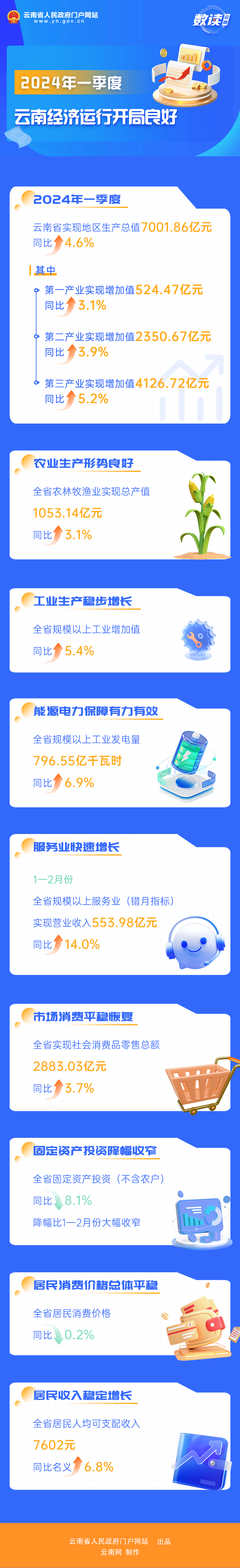 2024年一季度,云南堅持穩(wěn)中求進工作總基調(diào),錨定“3815”戰(zhàn)略發(fā)展目標,持續(xù)壯大“三大經(jīng)濟”,加快推進市場化、產(chǎn)業(yè)化、法治化、生態(tài)化、數(shù)字化進程,著力轉(zhuǎn)方式、調(diào)結(jié)構(gòu)、提質(zhì)量、增效益,推動經(jīng)濟穩(wěn)進提質(zhì)政策效應(yīng)逐步顯現(xiàn),生產(chǎn)穩(wěn)中有進、需求逐步企穩(wěn)、就業(yè)物價總體穩(wěn)定、居民收入穩(wěn)步增長,積極因素不斷積累,發(fā)展質(zhì)量穩(wěn)步提升,經(jīng)濟運行開局良好。