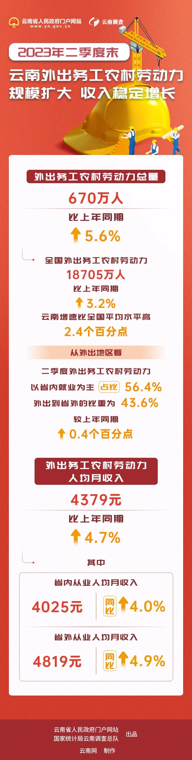 2023年二季度末,云南省外出務(wù)工農(nóng)村勞動力人均月收入為4379元,同比增長4.7%。其中,省內(nèi)從業(yè)人均月收入4025元,同比增長4.0%;省外從業(yè)人均月收入4819元,同比增長4.9%。