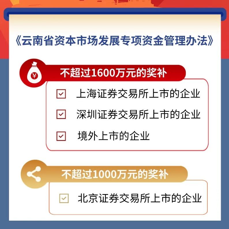 印發(fā)《云南省資本市場(chǎng)發(fā)展專(zhuān)項(xiàng)資金管理辦法》,獎(jiǎng)補(bǔ)標(biāo)準(zhǔn)居全國(guó)前列,為我省資本市場(chǎng)發(fā)展提供更為完善的資金政策保障。