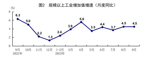 前三季度,全國規(guī)模以上工業(yè)增加值同比增長4.0%,比上半年加快0.2個百分點。分三大門類看,采礦業(yè)增加值同比增長1.7%,制造業(yè)增長4.4%,電力、熱力、燃?xì)饧八a(chǎn)和供應(yīng)業(yè)增長3.5%。裝備制造業(yè)增加值增長6.0%,比全部規(guī)模以上工業(yè)快2.0個百分點。分經(jīng)濟類型看,國有控股企業(yè)增加值同比增長4.6%;股份制企業(yè)增長4.8%,外商及港澳臺商投資企業(yè)增長0.5%;私營企業(yè)增長2.3%。分產(chǎn)品看,太陽能電池、充電樁、新能源汽車產(chǎn)量分別增長63.2%、34.2%、26.7%。9月份,規(guī)模以上工業(yè)增加值同比增長4.5%,增速與上月持平,比7月份加快0.8個百分點;環(huán)比增長0.36%。1-8月份,全國規(guī)模以上工業(yè)企業(yè)實現(xiàn)利潤總額同比下降11.7%,降幅比上半年收窄5.1個百分點,其中8月份同比增長17.2%。9月份,制造業(yè)采購經(jīng)理指數(shù)為50.2%,比上月上升0.5個百分點,企業(yè)生產(chǎn)經(jīng)營活動預(yù)期指數(shù)為55.5%。