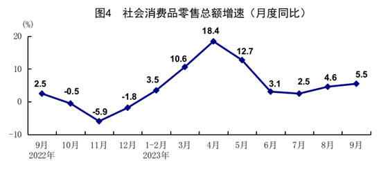前三季度,社會消費品零售總額342107億元,同比增長6.8%。按經(jīng)營單位所在地分,城鎮(zhèn)消費品零售額296410億元,同比增長6.7%;鄉(xiāng)村消費品零售額45697億元,增長7.4%。按消費類型分,商品零售305002億元,增長5.5%;餐飲收入37105億元,增長18.7%?;旧铑惿唐蜂N售穩(wěn)定增長,限額以上單位服裝鞋帽針紡織品類、糧油食品類商品零售額分別增長10.6%、5.3%。升級類商品銷售較快增長,限額以上單位金銀珠寶類、體育娛樂用品類、化妝品類商品零售額分別增長12.2%、8.3%、6.8%。全國網(wǎng)上零售額108198億元,同比增長11.6%。其中,實物商品網(wǎng)上零售額90435億元,增長8.9%,占社會消費品零售總額的比重為26.4%。9月份,社會消費品零售總額同比增長5.5%,比上月加快0.9個百分點,增速連續(xù)2個月加快;環(huán)比增長0.02%。前三季度,服務(wù)零售額同比增長18.9%。