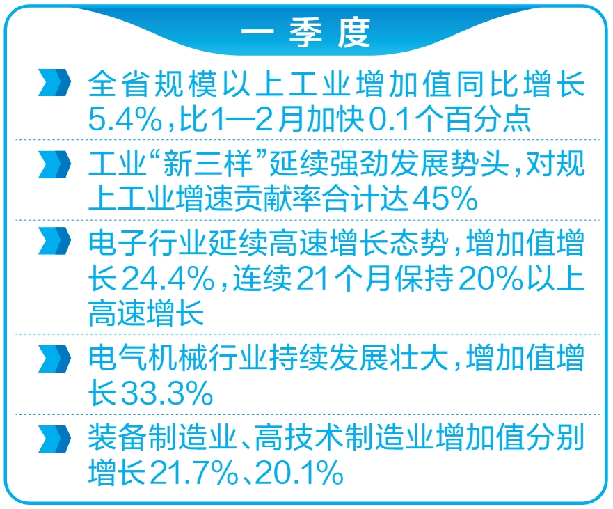 傳統(tǒng)行業(yè)支撐有力,優(yōu)勢產(chǎn)業(yè)集聚成勢,新興產(chǎn)業(yè)高速增長。今年以來,我省大抓產(chǎn)業(yè)、主攻工業(yè),緊緊扭住“八個關鍵性抓手”,聚力推進“四大支撐性工程”,加快構建現(xiàn)代化工業(yè)體系,工業(yè)經(jīng)濟穩(wěn)中有進,新動能加速蓄積。統(tǒng)計數(shù)據(jù)顯示,一季度,全省規(guī)模以上工業(yè)增加值同比增長5.4%,比1—2月加快0.1個百分點。