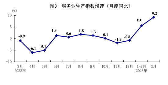 一季度,服務(wù)業(yè)增加值同比增長(zhǎng)5.4%,比上年四季度加快3.1個(gè)百分點(diǎn)。其中,住宿和餐飲業(yè),信息傳輸、軟件和信息技術(shù)服務(wù)業(yè),金融業(yè),租賃和商務(wù)服務(wù)業(yè),批發(fā)和零售業(yè)增加值分別增長(zhǎng)13.6%、11.2%、6.9%、6.0%、5.5%。3月份,全國(guó)服務(wù)業(yè)生產(chǎn)指數(shù)同比增長(zhǎng)9.2%,比1-2月份加快3.7個(gè)百分點(diǎn)。其中,住宿和餐飲業(yè),信息傳輸、軟件和信息技術(shù)服務(wù)業(yè),交通運(yùn)輸、倉(cāng)儲(chǔ)和郵政業(yè)生產(chǎn)指數(shù)分別增長(zhǎng)29.9%、12.0%、11.9%,比1-2月份分別加快18.3、2.7、7.7個(gè)百分點(diǎn)。1-2月份,規(guī)模以上服務(wù)業(yè)企業(yè)營(yíng)業(yè)收入同比增長(zhǎng)3.4%。3月份,服務(wù)業(yè)商務(wù)活動(dòng)指數(shù)為56.9%,業(yè)務(wù)活動(dòng)預(yù)期指數(shù)為63.2%。其中,零售、鐵路運(yùn)輸、道路運(yùn)輸、航空運(yùn)輸、租賃及商務(wù)服務(wù)等行業(yè)商務(wù)活動(dòng)指數(shù)高于60.0%。