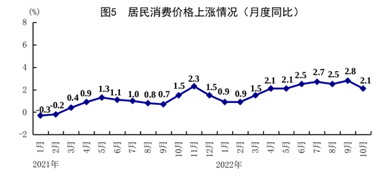 ?1-10月份,全國居民消費價格(CPI)同比上漲2.0%。10月份,全國居民消費價格同比上漲2.1%,漲幅比上月回落0.7個百分點;環(huán)比上漲0.1%。分類別看,食品煙酒價格同比上漲5.2%,衣著價格上漲0.5%,居住價格下降0.2%,生活用品及服務(wù)價格上漲1.4%,交通通信價格上漲3.1%,教育文化娛樂價格上漲1.2%,醫(yī)療保健價格上漲0.5%,其他用品及服務(wù)價格上漲1.9%。在食品煙酒價格中,鮮菜價格下降8.1%,糧食價格上漲3.6%,鮮果價格上漲12.6%,豬肉價格上漲51.8%??鄢称泛湍茉磧r格后的核心CPI同比上漲0.6%,漲幅與上月持平。
