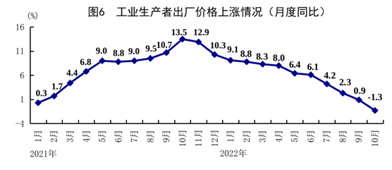 ?1-10月份,全國工業(yè)生產(chǎn)者出廠價格、工業(yè)生產(chǎn)者購進(jìn)價格同比分別上漲5.2%、7.5%。10 月份,全國工業(yè)生產(chǎn)者出廠價格同比下降1.3%,環(huán)比上漲0.2%;工業(yè)生產(chǎn)者購進(jìn)價格同比上漲0.3%,環(huán)比上漲0.3%。