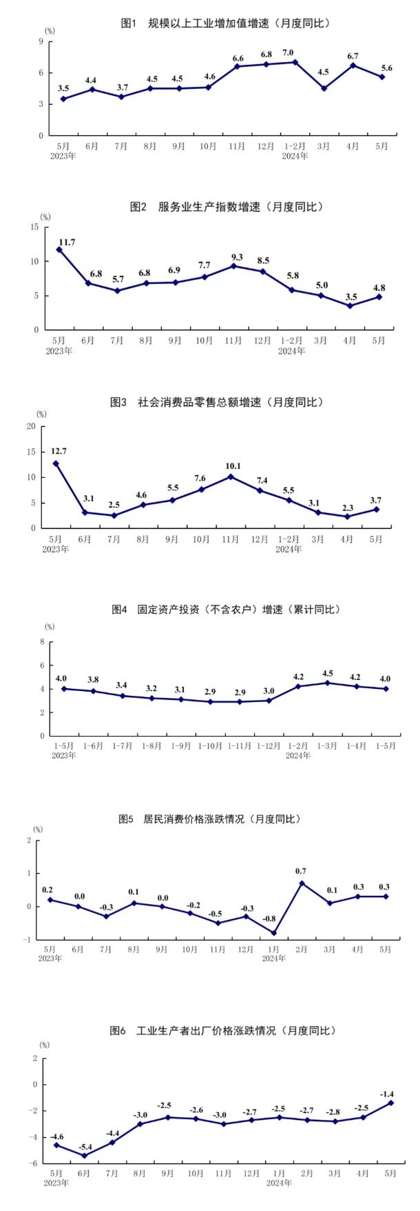 總的來看,5月份,經(jīng)濟運行總體平穩(wěn),主要指標(biāo)有所回升,新動能較快成長。但也要看到,當(dāng)前外部環(huán)境復(fù)雜嚴峻,國內(nèi)有效需求依然不足,經(jīng)濟持續(xù)回升向好仍面臨諸多困難挑戰(zhàn)。下階段,要堅持以習(xí)近平新時代中國特色社會主義思想為指導(dǎo),堅持穩(wěn)中求進工作總基調(diào),完整、準(zhǔn)確、全面貫徹新發(fā)展理念,加快構(gòu)建新發(fā)展格局,著力推動高質(zhì)量發(fā)展,靠前發(fā)力有效落實已經(jīng)確定的宏觀政策,因地制宜發(fā)展新質(zhì)生產(chǎn)力,堅定不移深化改革擴大開放,鞏固和增強經(jīng)濟回升向好態(tài)勢,持續(xù)推動經(jīng)濟實現(xiàn)質(zhì)的有效提升和量的合理增長。