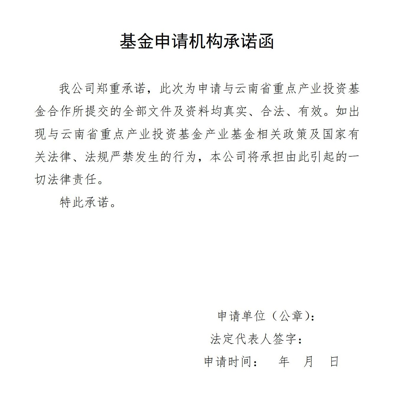 ? ? ??(二)申報(bào)事項(xiàng)。各行業(yè)主管部門(mén)、地方政府按照《產(chǎn)業(yè)基金申報(bào)指南》(見(jiàn)附件)的要求,向云南金控集團(tuán)或其指定的省重點(diǎn)基金管理人提交申報(bào)設(shè)立產(chǎn)業(yè)基金文件,包括產(chǎn)業(yè)基金設(shè)立方案、基金管理人情況、基金章程或協(xié)議草案、出資人出資意向及出資能力證明等相關(guān)材料。